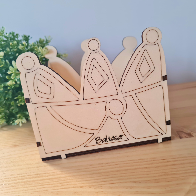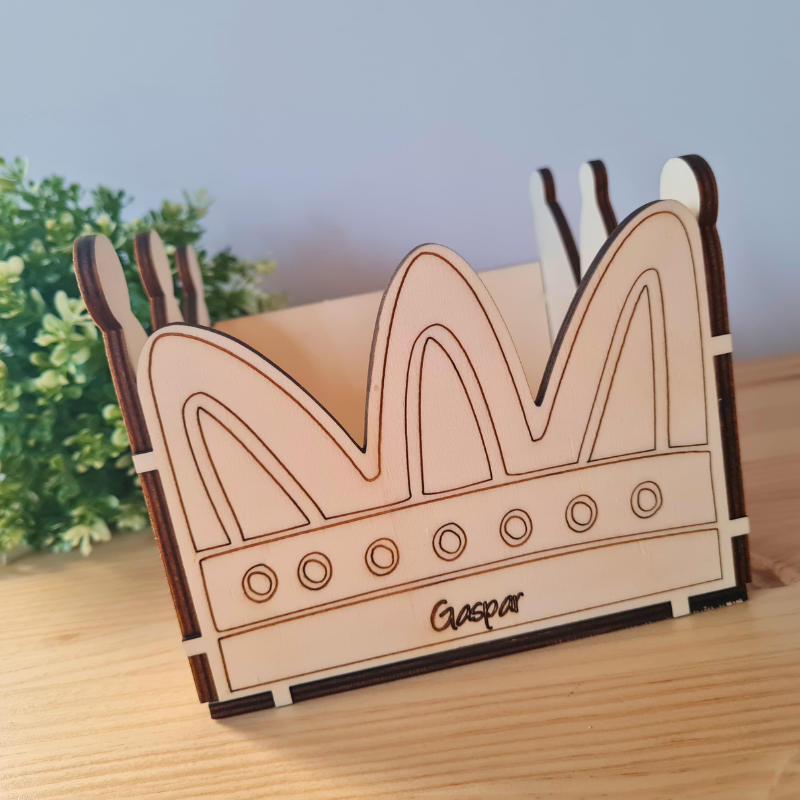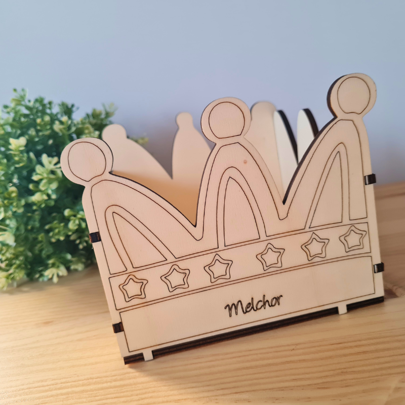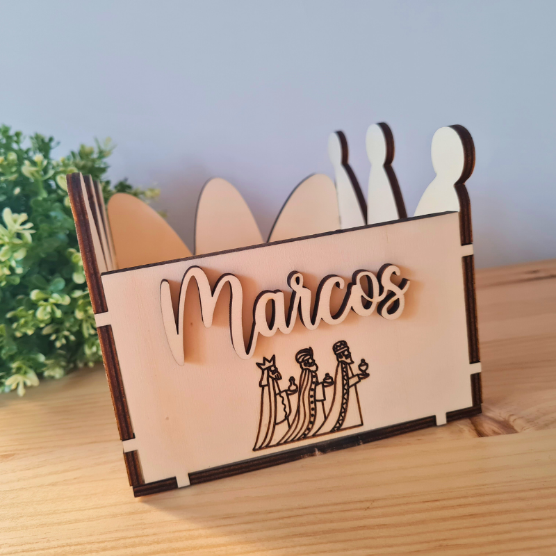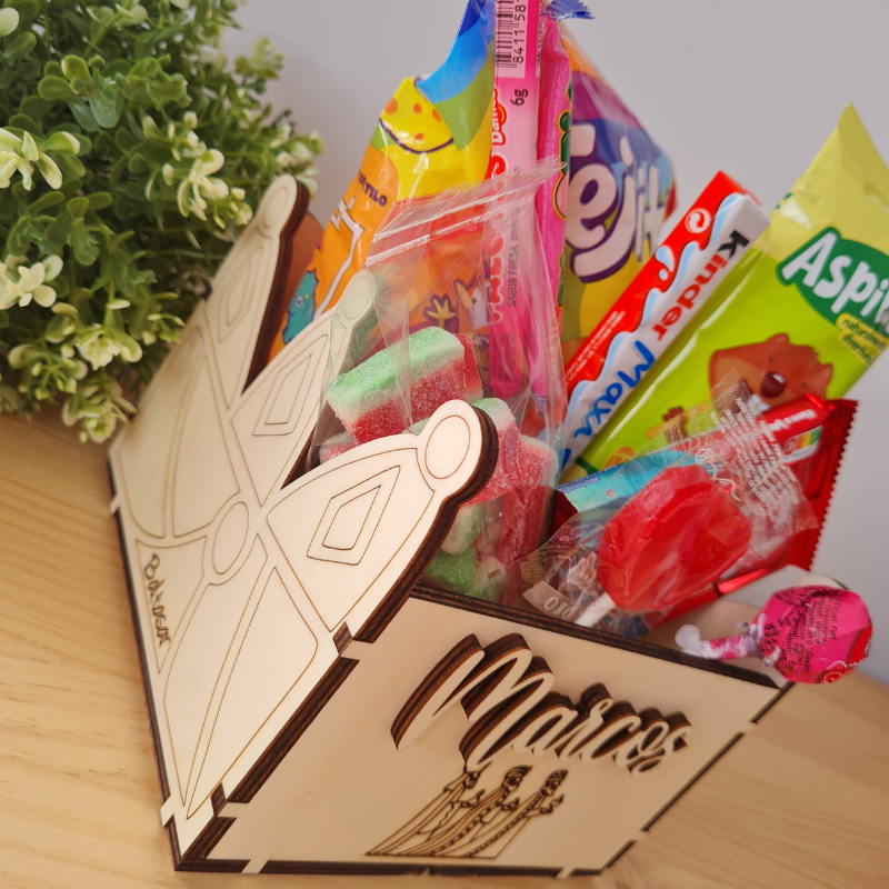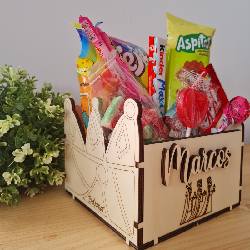 Bonita y original cesta para dejarles a los peques de la casa las golosinas/chocolatinas o algún regalito que quepa en ella. Fabricada en madera contrachapada de 5mm de grosor, y en forma cuadrada. La cesta tiene un grabado muy divertido, donde cuenta con un diseño donde en cada lado tiene la corona de cada rey mago y en la cara que queda se situaría el nombre del peque o peques y una ilustración de los tres reyes de oriente.