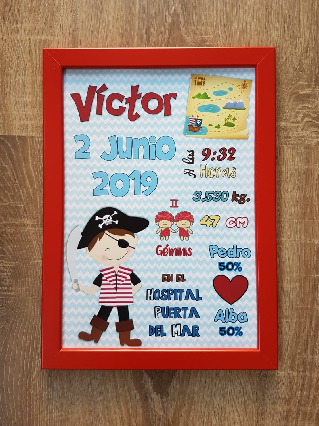 Cuadro natalicio personalizado, el cual es un elemento decorativo divertido y original para el cuarto del bebé, donde queda recogido los datos del recién nacido. Ideal como regalo para recién nacidos y bebés.
