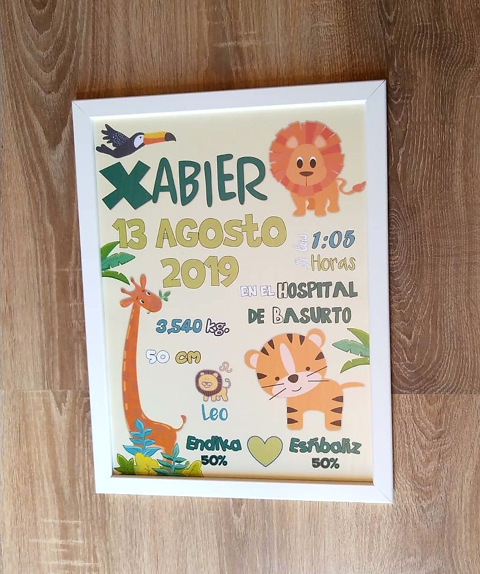 Cuadro natalicio personalizado, el cual es un elemento decorativo divertido y original para el cuarto del bebé, donde queda recogido los datos del recién nacido. Ideal como regalo para recién nacidos y bebés.