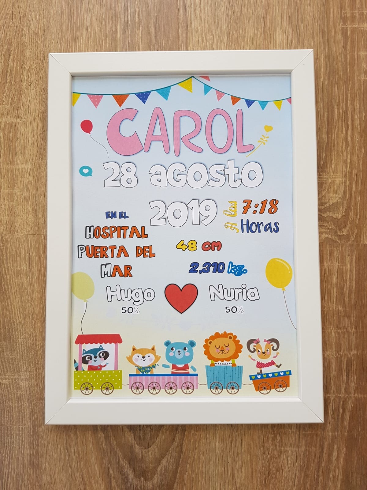 Cuadro natalicio personalizado, el cual es un elemento decorativo divertido y original para el cuarto del bebé, donde queda recogido los datos del recién nacido. Ideal como regalo para recién nacidos y bebés.