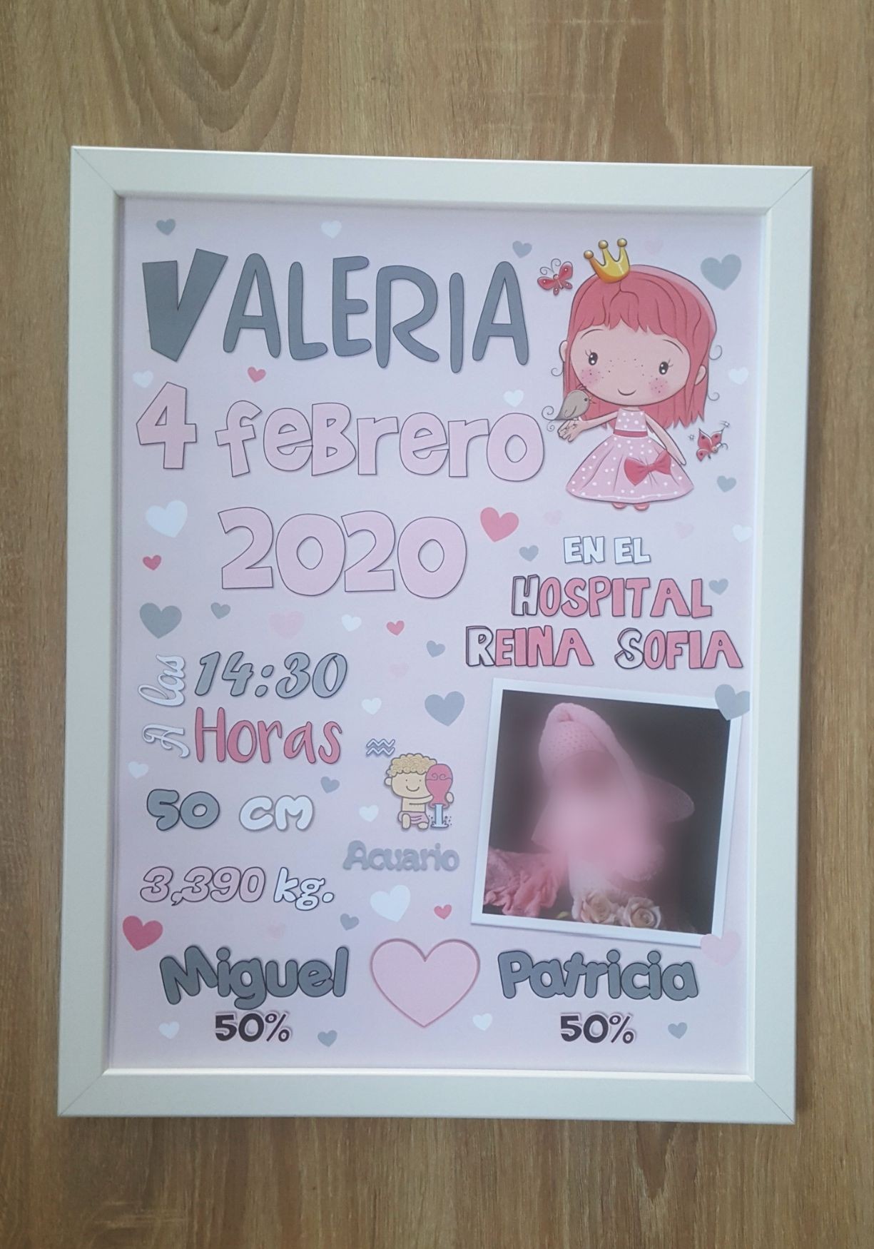 Cuadro natalicio personalizado, el cual es un elemento decorativo divertido y original para el cuarto del bebé, donde queda recogido los datos del recién nacido. Ideal como regalo para recién nacidos y bebés.