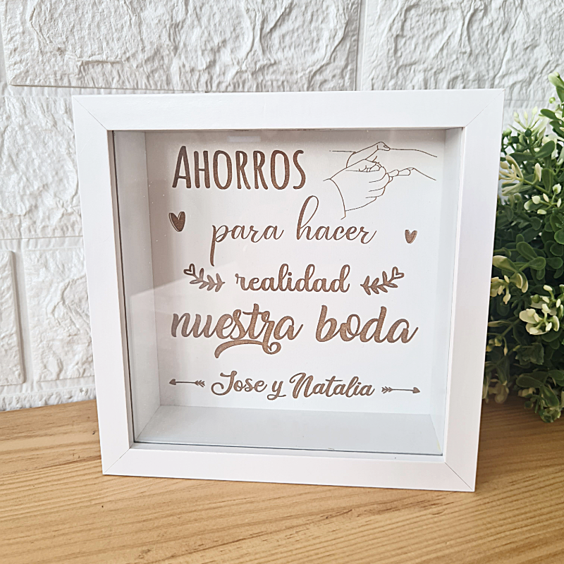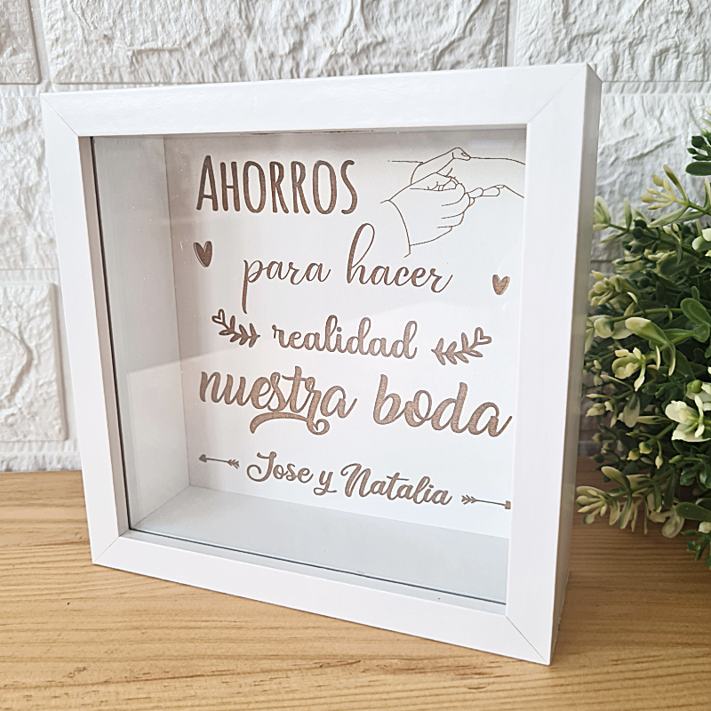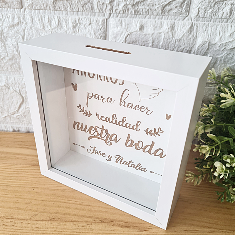 Hucha de madera personalizada con el nombre de la pareja la que se quiere casar, y así poder ahorrar para tener la boda de sus sueños.