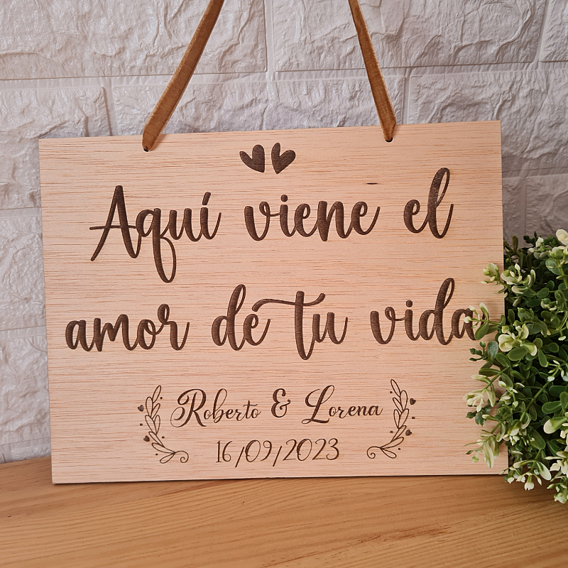 Debajo de la frase van los nombres de los novios y la fecha de la boda.