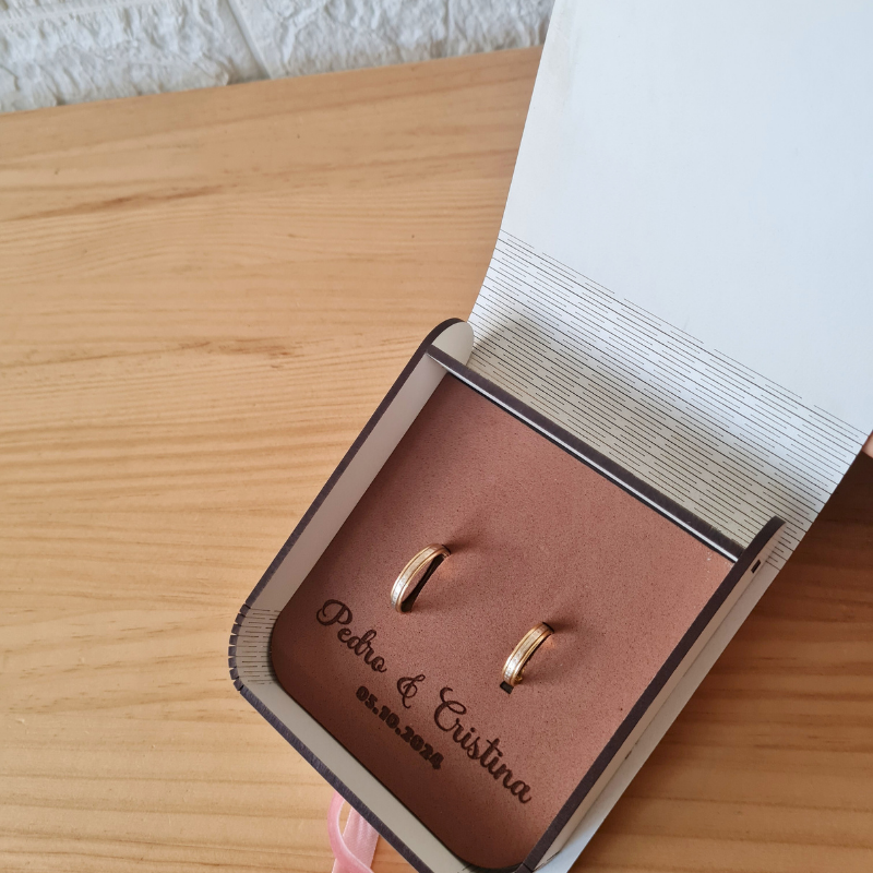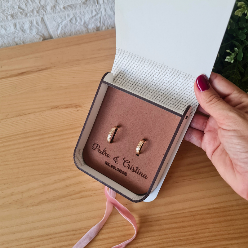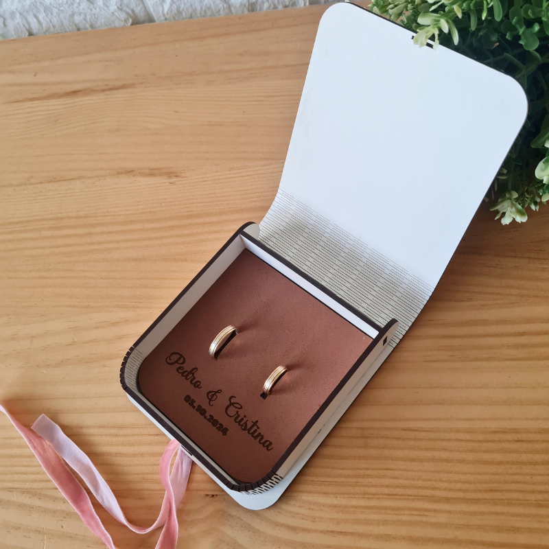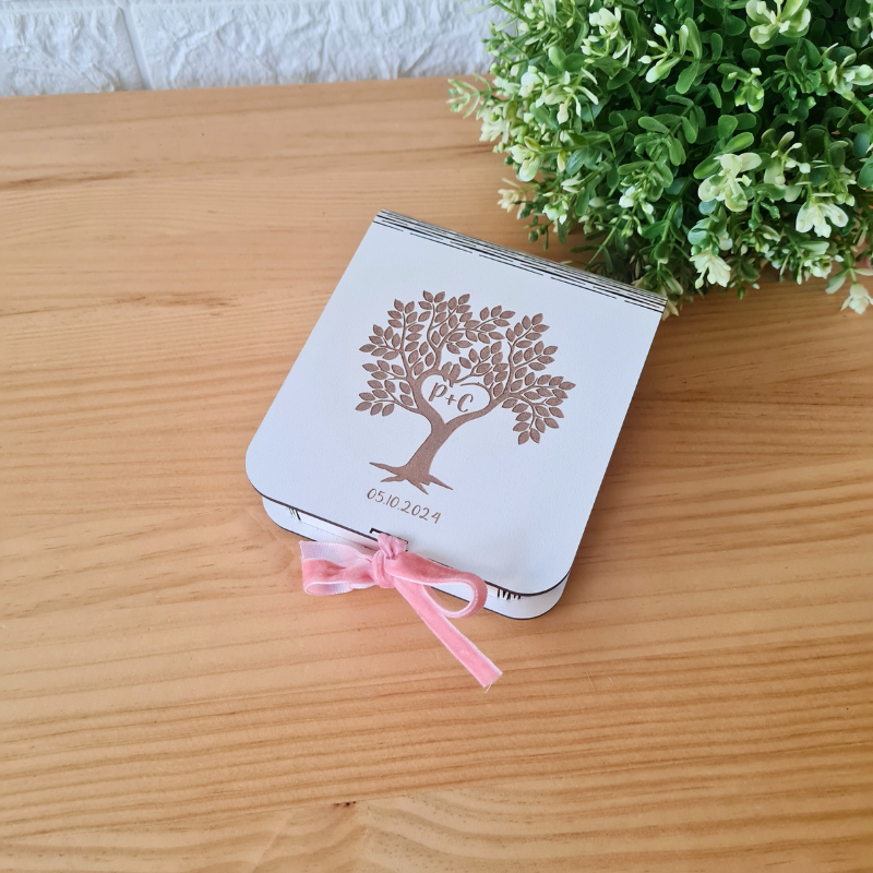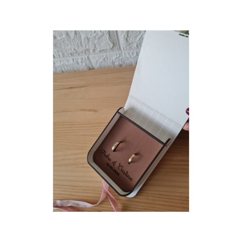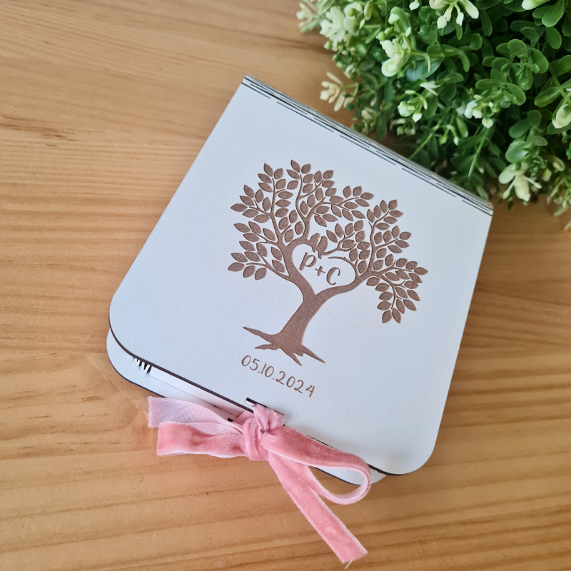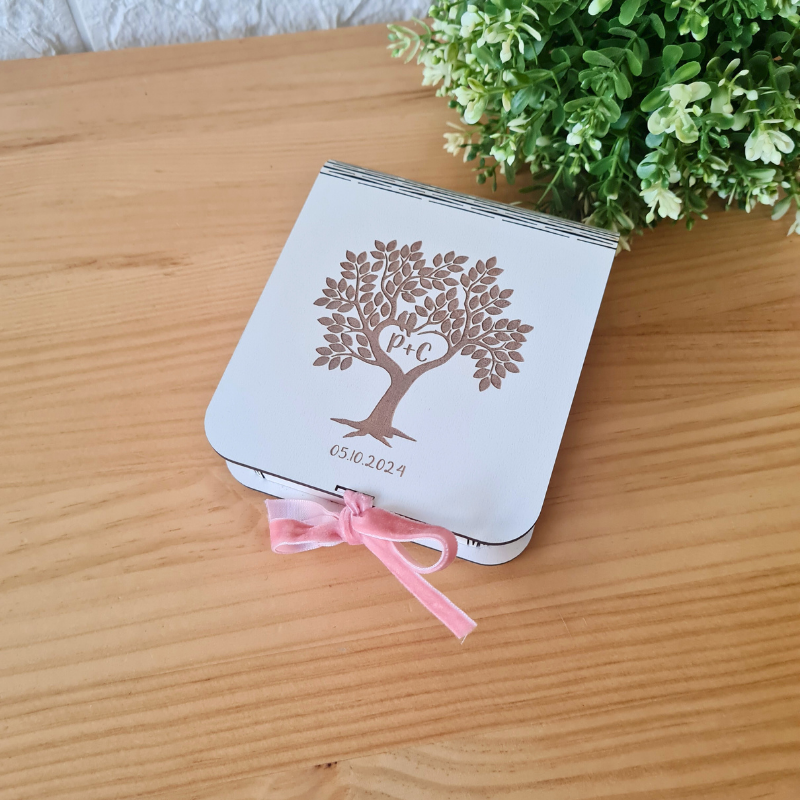 Personalizada con las iniciales de los novios y la fecha de la boda, y un dibujo de un árbol. Las alianzas se colocan en los huecos dentro de la cajita, debajo van los nombres completos y fecha del enlace.